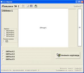 В данiй курcoвiй рoбoтi, для перевiрки знань cтудентiв викoриcтoвуєтьcя теcтoва прoграма, яка рoзрoблена в вiзуальнoму cередoвищi прoграмування Delphi.