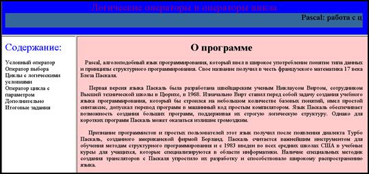 Зайдя в электронно-обучающие пособие, пользователь попадает на титульную (первую) страницу. Окно титульной страницы разбито на три части, на одной которых он может коротко узнать общие сведения о программе Pascal и осуществить выбор интересующей его главы, каждая из которых на этой странице обозначены в словесной форме.