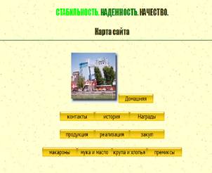 Для упрощения навигации использованы закладки, позволяющие перемещаться с выбранной темы к конкретному месту на странице. (Например: "продукция"->"макароны"->"приобрести"->выход на место макарон на странице заказа продукции).