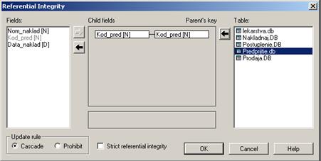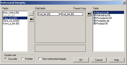 Фирма, занимающаяся продажей и учетом лекарственных средств. Для осуществления операций с поставками и заказами новых лекарственных средств, им необходимо заполнить накладные, в накладной указаны предприятие, которое осуществляет поставку, дата прибытия лекарств на склад. После лекарственные средства подсчитывают, устанавливают на них цену, по которой их будут продавать. Когда лекарства подсчитаны и установлена цена на него, то их распространяют по торговым точкам. В магазинах, которые занимаются продажей лекарств, при продаже его выдается чек покупателю, где указана дата продажи, количество купленного лекарства, стоимость за единицу товара. На основе полученных документов были созданы таблицы с полями.