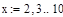 где x - переменная, a,b,c - значения, которые принимает переменная, т.е. a-первое значение, b-второе значение, т.е. (b-a) - шаг изменения переменной, и c-последнее значение.