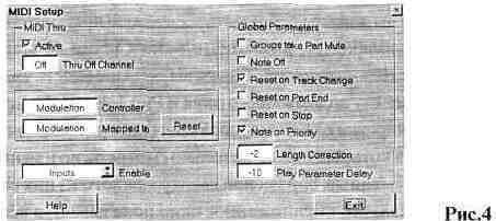 выберите пункт MIDI Setup (Рис.4). В появившейся диалоговой панели в окошке левее надписи Enable поставьте галочки напротив тех