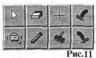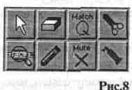 набором инструментов (Рис.8), которые призваны обслуживать части, находящиеся в этом самом рабочем окне. Не отпуская кнопку мыши, подведите курсор к желаемой иконке. Иконка должна как бы вжаться и сменить свой цвет на более темный. Отпустите кнопку мыши. Теперь вместо стрелки вы имеете курсором тот инструмент из предоставляемого набора, который вы выбрали. Итак, у вас есть часть (или части). Выбрав ластик и нажав им на часть, вы удалите ее. Выбрав ножницы, вы можете резать части на более мелкие фрагменты, которые также будут являться вновь создан ньши частями. Выбрав лупу и ведя ею вдоль части, вы можете прослушать (весьма своеобразно) партию, записанную в ней с тем именно инструментом, который выбран в Part Info в Prg.