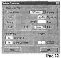 Groove Quantize - мой любимый тип квантайза. Здесь вы можете сами составить список Groove (или воспользоваться уже существующим), попросить кого-нибудь или сыграть самому (если сможете) различные кусочки свинговых, балладных рисунков, в общем все, что сочтете нужным. Учтите лишь то, что программе все равно, как вы сыграли это в смысле мелодии. Ей важны лишь ритмические нюансы. Если вам не хватает драйва для того, чтобы сыграть образец на одной ноте, сыграйте хоть «Полет шмеля», но затем переместите все ноты (до, ре, ми...) в одну (например, ля). В любой момент вы можете загрузить определенный набор (много, но опять же в разумных пределах) рисунков и обработать ими материал. Нотам передастся не только ритмический характер образца, но, если захотите, то и значения