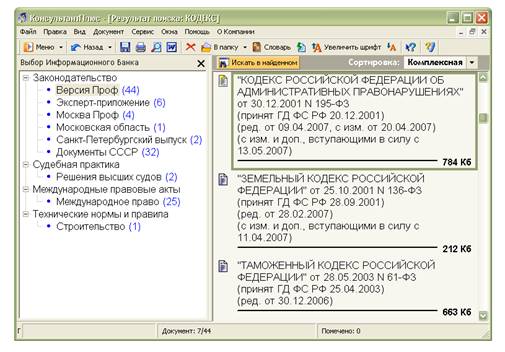 Справочно-Правовые Системы Консультант Плюс охватывают все федеральное законодательство и международное право, архивные правовые акты и законопроекты, содержат справочную и консультационную информацию по бухгалтерскому учету и налогообложению, комментарии законодательства, типовые формы документов, информационные банки, включающие судебные акты всех 10 федеральных арбитражных судов округов РФ, информационные банки по региональному законодательству, содержащие правовые акты 83 субъектов РФ. На сегодняшний день это крупнейший информационный массив, который может быть предоставлен пользователю. Всего в справочную систему Консультант Плюс входит более 4 000 000 документов.