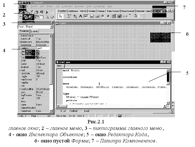 При запуске DELPHI на экране появляется панель интерфейса, показанная на рис. 1.1. Среда DELPHI визуально реализуется в виде нескольких одновременно раскрытых на экране монитора окон. Количество, расположение, размер и вид окон может изменяться программистом.