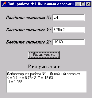 Цель лабораторной работы: изучить основные элементы визуальной среды, освоить использование простейших компонентов DELPHI для ввода/вывода данных, и создать приложение, которое использует линейный алгоритм.
