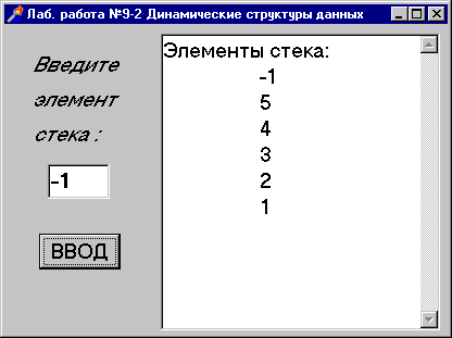 Задание2: создать приложение для формирования стека, который заполняется путем ввода целых положительных чисел с клавиатуры. Как только будет введено первое отрицательное число, содержимое стека выводится на панель интерфейса, а память занимаемая его элементами освобождается.