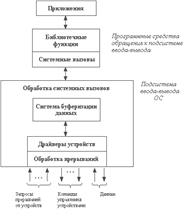 | Для решения поставленных проблем целесообразно разделить программное обеспечение ввода-вывода на четыре слоя (см. рис. 1) 1)Обработка прерываний 2)Драйверы устройств 3)Независимый от устройств слой операционной системы 4)Пользовательский слой программного обеспечения. Рис.1. Многоуровневая организация подсистемы ввода-вывода