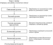 Кэширование диска. В файловых системах запросы к внешним устройствам, в которых адресация осуществляется блоками, перехватываются промежуточным программным слоем-подсистемой буферизации. Подсистема буферизации представляет собой буферный пул, располагающийся в оперативной памяти, и комплекс программ, управляющих этим пулом. Каждый буфер пула имеет размер, равный одному блоку.Функционирование любой файловой системы можно представить многоуровневой моделью (см. рис. 3), в которой каждый уровень предоставляет некоторый интерфейс (набор функций) вышележащему уровню, а сам, в свою очередь, для выполнения своей работы использует интерфейс (обращается с набором запросов) нижележащего уровня. Рис. 3. Общая модель файловой системы |