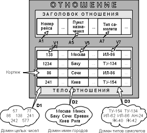 Доменом называется множество атомарных значений одного и того же типа. Смысл доменов состоит в следующем. Если значения двух атрибутов берутся из одного и того же домена, то, вероятно, имеют смысл сравнения, использующие эти два атрибута (например, для организации транзитного рейса можно дать запрос "Выдать рейсы, в которых время вылета из Москвы в Сочи больше времени прибытия из Архангельска в Москву"). Если же значения двух атрибутов берутся из различных доменов, то их сравнение, вероятно, лишено смысла: стоит ли сравнивать номер рейса со стоимостью билета? Отношение на доменах D1, D2, ..., Dn (не обязательно, чтобы все они были различны) состоит из заголовка и тела. На рис. 3 приведен пример отношения для расписания движения самолетов.