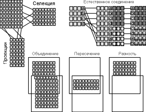 Предложив реляционную модель данных, Э.Ф.Кодд создал и инструмент для удобной работы с отношениями – реляционную алгебру. Каждая операция этой алгебры использует одну или несколько таблиц (отношений) в качестве ее операндов и продуцирует в результате новую таблицу, т.е. позволяет "разрезать" или "склеивать" таблицы (рис. 5).