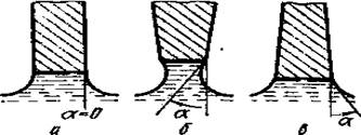 | РИС. 1. Форма мениска расплава и изменение контактного угла при вытягивании кристалла из расплава: а - стационарный рост, а = 0; б - сужение кристалла, а < 0; в - расширение кристалла, а > 0 |