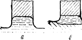 а - понижение уровня фронта кристаллизации па краях кристалла вследствие неравномерного охлаждения; б - подъем основания мениска в результате применения тигля с приподнятыми краями при сохранении плоского фронта кристаллизации