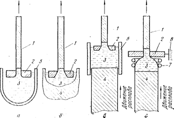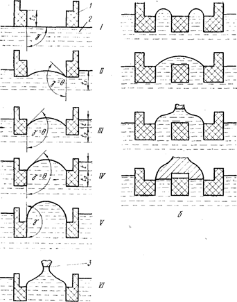 Как следует из приведенного рисунка, положения II—V соответствуют выпуклым столбам расплава, которые могут быть образованы внутри формообразующего отверстия (положения I - III) или над ним (IV—V). Таким образом, образование столба расплава происходит в формообразователе под действием давления расплава без затравки.
