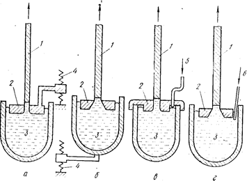 а—система с опусканием формообразователя; б —система с подъемом тигля; в — регулирование уровня расплава; г— подпитка расплава;