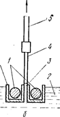 1 — индуктор; 5 — расплав; 3 — сформированный столб расплава; 4 —затравка; 5— тянущий шток; б— вспомогательный контактный формообразователь