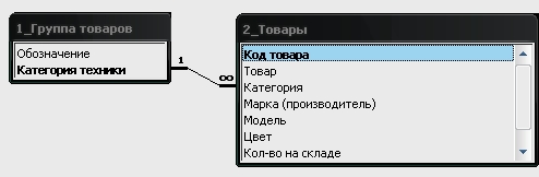 В нашем случае, для связи таблиц базы данных "1_Группа товаров" и "2_Товары" используется связь типа “один - ко - многим". При таком типе связи каждой записи в одной таблице соответствует несколько записей в связанной таблице. Одна из них представляет сторону "один" (в нашем случае таблица "1_Группа товаров"), другая - сторону "много" (в нашем случае таблица "2_Товары"). Для связи этих таблиц нужно использовать только часть информации о товаре.