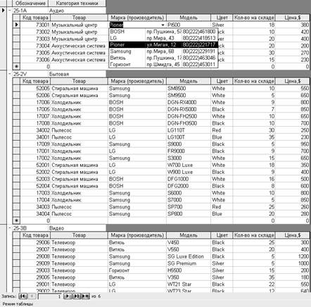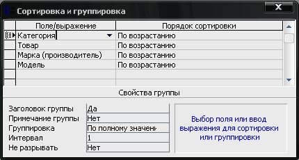 В таблице "1_Группа товаров" ключевым будет являться поле "категория техники". Оно же имеет свойство "Совпадения не допускаются". Для поля "Марка (производитель)" таблицы "2_Товары", значения выбираются из списка. Источник списка создается при помощи мастера подстановок.