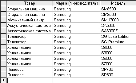 Создать список, отобразив только товар, марку и модель, произведенные маркой Samsung.