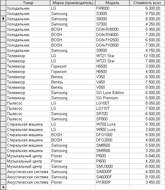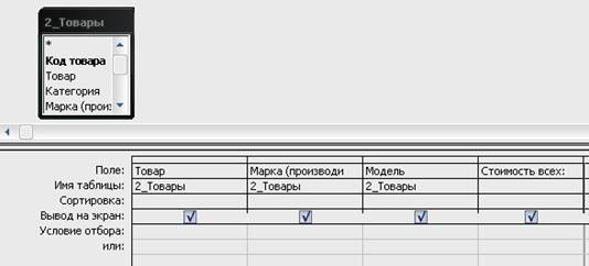 Отобразить товар, марку, модель, а также новое поле "стоимость всех". Для этого в режиме “конструктор” создадим соответствующий запрос.