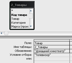 Необходимо в таблице "2_Товары" в поле “Товар” поменять значение с “Телевизор” на “Домашний кинотеатр”. Для этого можно создать запрос на обновление. Для этого необходимо в режиме “конструктор” выбрать соответствующий тип запроса и в строке обновление сделать запись “Домашний кинотеатр”, а в строке условие отбора - “Телевизор".