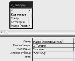 Для этого в режиме “конструктор” необходимо создать запрос на удаление и в строке “условие отбора” поля “марка (производитель) ” внести запись ”Samsung". Запрос в режиме “конструктор” будет иметь вид, представленный на рисунке 2.2.5.1.