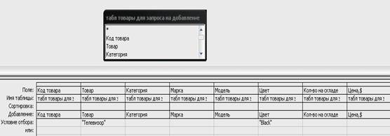 Поместим данные только о товарах телевизорах с черным (Black) цветом в таблицу "Black телевизоры (на добавление)". Для этого можно воспользоваться запросом на добавление. В котором необходимо указать имя таблицы, в которую будут помещены данные и соответствующие поля. Пример создания запроса на добавление в режиме “конструктор” представлен на рисунке 2.2.6.1.