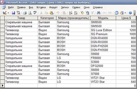 qd. SQL = "SELECT [Товар], [Категория], [Марка (производитель)], [Модель], [Цена,$] FROM [2_Товары] WHERE ([2_Товары]. [Цена,$]) >500"