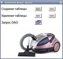 Создадим главную кнопочную форму "Кнопочная форма", которая будет содержать следующие кнопки: создание таблицы в объектных моделях DAO и ADO, удаление таблицы в объектных моделях DAO и ADO, создание запроса DAO. Главная кнопочная форма представлена на рисунке 3.4.1.