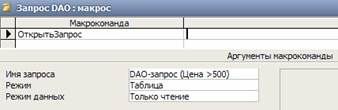 Создадим макрос на выполнение запроса DAO. Для этого указываем макрокоманду открыть запрос, в окне аргументов макрокоманды указываем имя запроса "DAO-запрос (Цена >500)", режим "Таблица", режим данных "Только чтение". На рисунке 3.4 2 представлен макрос режиме конструктор.