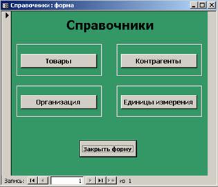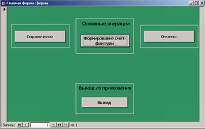 После автоматического закрытия заставки появляется главная форма. На главной форме расположены следующие кнопки: «Справочники», «Формирование счет-фактуры», «Отчеты» и «Выход». Главная форма представлена на рисунке Б.2.