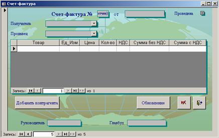При нажатии кнопки «Формирование счет-фактуры» открывается форма «Счет-фактура», которая представлена на рисунке Б.5. Чтобы сформировать новую счет-фактуру, необходимо ввести следующие реквизиты: получатель, продавец, наименование товара и его характеристики. Затем рассчитать сумму, нажав кнопку «Обновление», и провести документ.