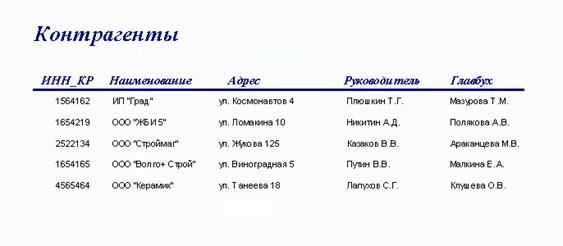 Например, если пользователь решил просмотреть отчет о контрагентах, то необходимо нажать кнопку «Контрагенты». Отчет о контрагентах представлен на рисунке Б.7.