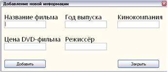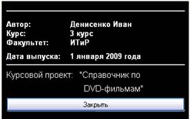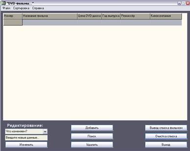 Дорогой Александр Григорьевич если вы читаете это введение, значит я наконец – то закончил свой курсовой проект. Он называется «База данных DVD – фильмов». Скорее всего, он ни кому, ни будет, нужен и денег я на нем не заработаю. Это очень печально. Хотя если взглянуть на это с другой стороны, то почти у каждого человека в этом мире есть своя коллекция DVD - фильмов и мысль, что эта программа может им пригодиться, меня очень радует. Как говорится, нет худа, без добра. Программа очень проста в использовании и ест очень мало ресурсов. Работает почти на любой операционной системе и на любом компьютере. Теперь поговорим о самой программе. Она многофункциональна. Занесенную информацию о DVD – фильмах можно изменять, удалять и редактировать. Информация о дисках записывается в базу данных по пяти полям: название диска, цена, год выпуска, фамилия режиссера, кинокомпания, которая создавала фильм. Также можно сортировать диски по этим же полям. В общем, она настолько проста, что даже ребенок может в ней разобраться. А самое главное, что программа написана на русском языке да еще русским студентом третьего курса, АФРГСУ который учится на факультете ИТиР. Как это расшифровывается, я до сих пор не могу запомнить!!!