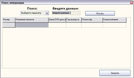 При нажатии кнопки поиск отображается окно поиска. Поиск происходит по пяти параметрам. Выбираем один из параметров, вводим данные и начинается поиск, найденные данные выводятся в этом же окне в таблице.