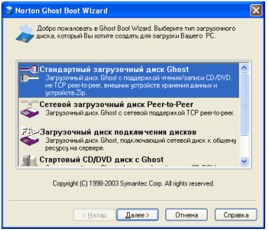 ● Norton Ghost помошник по загрузке (Norton Ghost Boot Wizard), которая позволяет создавать загрузочную дискету или загрузочный компакт-диск;