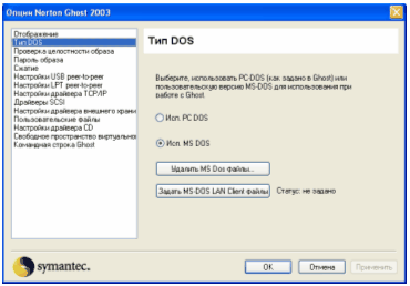 Элементы управления, размещенные на странице Тип DOS (DOS type) (см. рис.1.6), позволяют выбрать однозадачную операционную систему, которая будет использоваться Norton Ghost. По умолчанию в качестве таковой используется PC DOS компании Symantec (установлен переключатель Исп. PC DOS (Use PC DOS)). Рекомендуется пользоваться «проверенной» и более знакомой MS-DOS от Microsoft. Для этого нужно выполнить следующие действия: