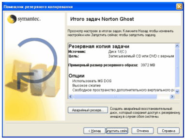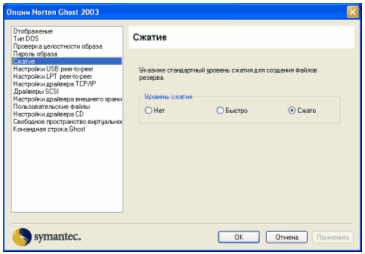 Высокая степень сжатия (переключатель Сжато (High)) замедляет процесс создания образа, однако позволит сэкономить до 30 % места на носителе, и сократить время на пересылку файла образа по сети. По умолчанию используется «быстрое» сжатие (переключатель Быстро (Fast)). Для сжатия данных Norton Ghost применяет свой собственный алгоритм, отличающийся, например, от используемых в архиваторах WinRAR и WinZip.