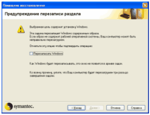 Восстановление выполняется в режиме DOS, после перезагрузки компьютера. При этом никакой информации о ходе восстановления на экране нет. После завершения процедуры Drive Image вновь перезагрузит компьютер (также без каких-либо дополнительных сообщений).
