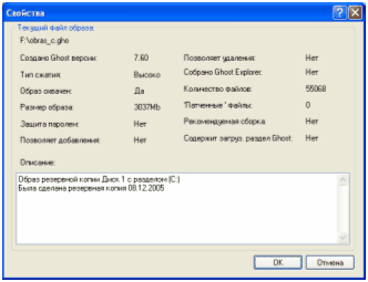 ● Properties (Свойства) — вывод на экран информационного окна с описанием основных параметров файла образа (размер, дата создания, метка, буква диска и тип файловой системы исходного раздела, степень сжатия, наличие парольной защиты).