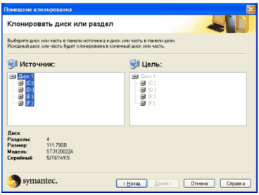 ● Клонировать (Clone) — зеркальный перенос содержимого жесткого диска или раздела на другой диск (раздел);