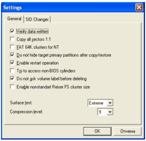 ● виды предварительного тестирования диска-источника, диска-приемника и файла образа; используемые тесты определяются установкой следующих флажков: