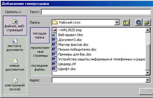11. Щелкните на кнопке Файл в окне диалога Вставка гиперссылки. На экране появится окно, содержащее список файлов, доступных на вашем компьютере или в локальной сети.