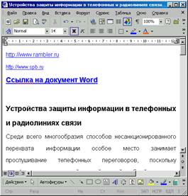 Гиперссылкой называется текстовый фрагмент или другой объект, который связывает текущий документ с другими web-документами. Для создания гиперссылок вы можете использовать Мастера создания веб-страниц, но также можете расставить гиперссылки в документе вручную. Гиперссылки могут понадобиться для перехода между документами Word, Excel, Access и PowerPoint. Кроме того, гиперссылка позволять перейти к конкретному месту в документе. Формат гиперссылки включает адрес объекта ссылки. Это может быть путь к документу на локальном диске Когда вы щелкаете на гиперссылке в документе, соответствующая программа открывает документ, на который указывает эта гиперссылка. При работе с документами из пакета Office XP Word будет открывать эти документы в собственном окне. Если гиперссылка указывает на документ другого типа, он будет открыт в своей программе.