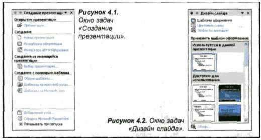 В підрозділі "Создание" розділ вікна задач "Создание презентации" перераховані способи створення презентації (мал.4.1):