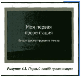 Обрати необхідний шаблон оформлення презентації двічі клацнувши по ньому мишею. Наприклад ми обрали шаблон "Разрез". Клацнувши по ньому цей шаблон буде застосовано. Клацнувши мишею в полі місце заповнення Заголовок слайда та ввести із клавіатури необхідний текст. Потім клацнути по полю місце заповнення "Подзаголовок слайда" і ввести потрібний текст. Для завершення вводу тексту потрібно мишою клацнути за текстовим полем. Наш перший слайд створено (мал.4.3).