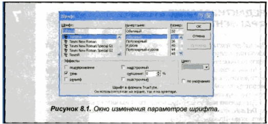 Для того щоб змінити шрифт у нашій презентації необхідно виділити наприклад заголовок слайду, а потім в рядку "Шрифт" на панелі "Форматирование" клацнути по кнопці (чорний трикутничок) та обрати із списку новий шрифт, наприклад "Comic Sans MS". В результаті шрифт заголовку зміниться на обраний. Можна змінити розмір шрифту виділивши заголовок слайду і клацнувши по кнопці (чорний трикутничок) в рядку "Размер". В списку обрати потрібний розмір шрифту. Також можна змінити написання шрифту за допомогою кнопок "Полужирный", "Курсив", "Подчёркнутый". Також змінити всі ці параметри одразу можна задавши команду "Формат" - "Шрифт". Виділити в тексті потрібне слово чи речення та задати вказану команду. Відкриється вікно "Шрифт" (мал.8.1).