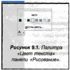 Відкриється палітра кольорів (мал.9.1), в якій клацнути на клітинці необхідного кольору. Також можна змінити колір фону, виділивши необхідні слова, при цьому натиснути по (чорному трикутничку) "Цвет заливки".