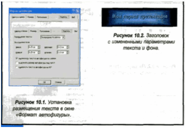 Можна змінити вирівнювання тексту в слайді. Необхідно виділити текст заголовку і клацнути по кнопці "По центру" на панелі "Форматирование". Заголовок вирівняється по центру. Для того щоб встановити вирівнювання тексту заголовка по вертикалі, потрібно двічі клацнути мишею по ньому. З’явиться вікно "Формат автофигуры", в якому потрібно перейти на закладку "Надпись" (мал.10.1).